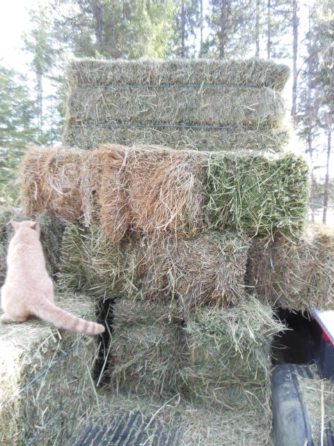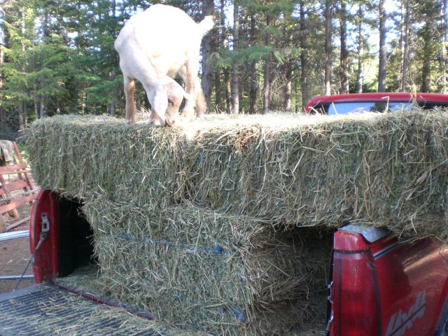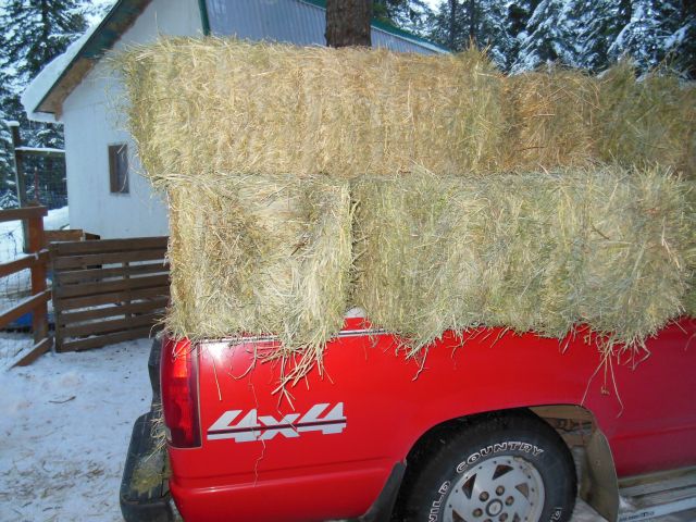 hay, stinker babies, bug 015The bottom layer of hay gets turned on its side, so the strings are facing the pickup bed walls.