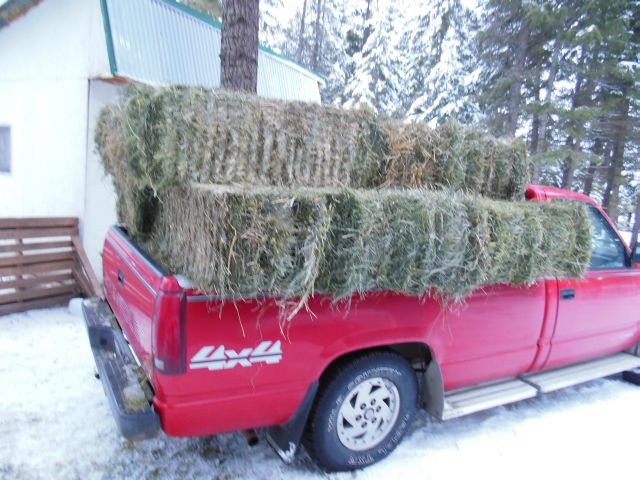 When loading 100 – 120 lb bales, the loading pattern is similar to 80 lb bales. The bottom layer gets six bales turned on it’s side, with the strings facing the sides of the pickup bed. The second layer gets 10 bales, with the strings facing up. The third layer gets six bales, with the three foremost bales parallel to the second layer of bales, covering the center seam of the 2nd layer. The three hindmost bales are turned perpendicular to the other bales. This gives a more secure load that won’t slide or roll off when starting and stopping. I was able to haul 22 100-120 lb bales 60 miles on highway and bumpy roads without a tie strap this way. The sheep and goats are thanking me, but my back is not 🙂