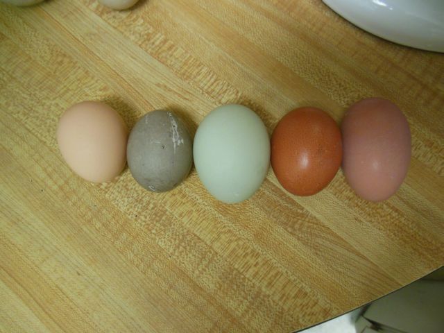 snow, eggs, maddy kids 009Game hen egg, first year duck egg, second year duck egg, Maran egg, Faverolle egg.