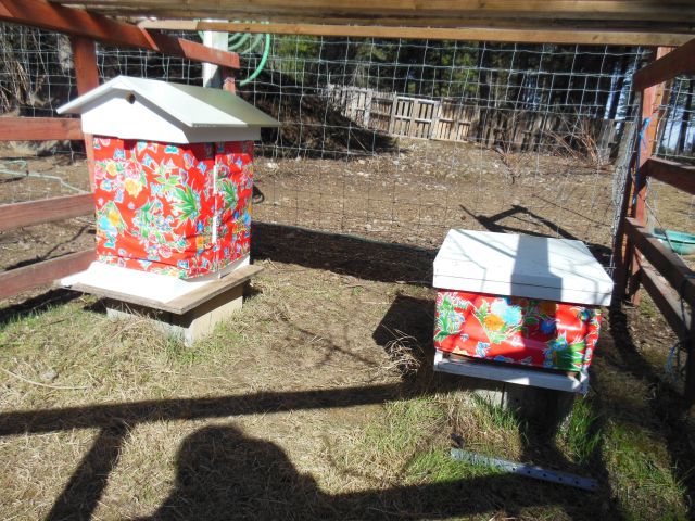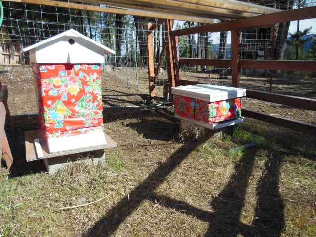 On the left is the new 8 frame hive with a bucket feeder. On the right is a traditional 10 frame flat topped hive with a frame feeder.