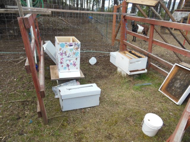 It was snowing when the bees arrived, so we couldn’t put them directly into their hives and they had to sit in the shop overnight to avoid freezing. They just came up from California four days ago, so they aren’t prepared for snow 🙂