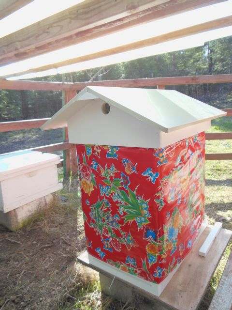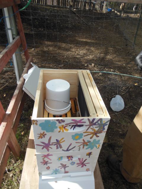 4-2013: Heather painted a fabulous 8 frame hive 🙂 I wanted to try a garden style hivery cover as well as a screen base that is supposed to help keep varroa mites under control. We’ll see if that makes a difference.